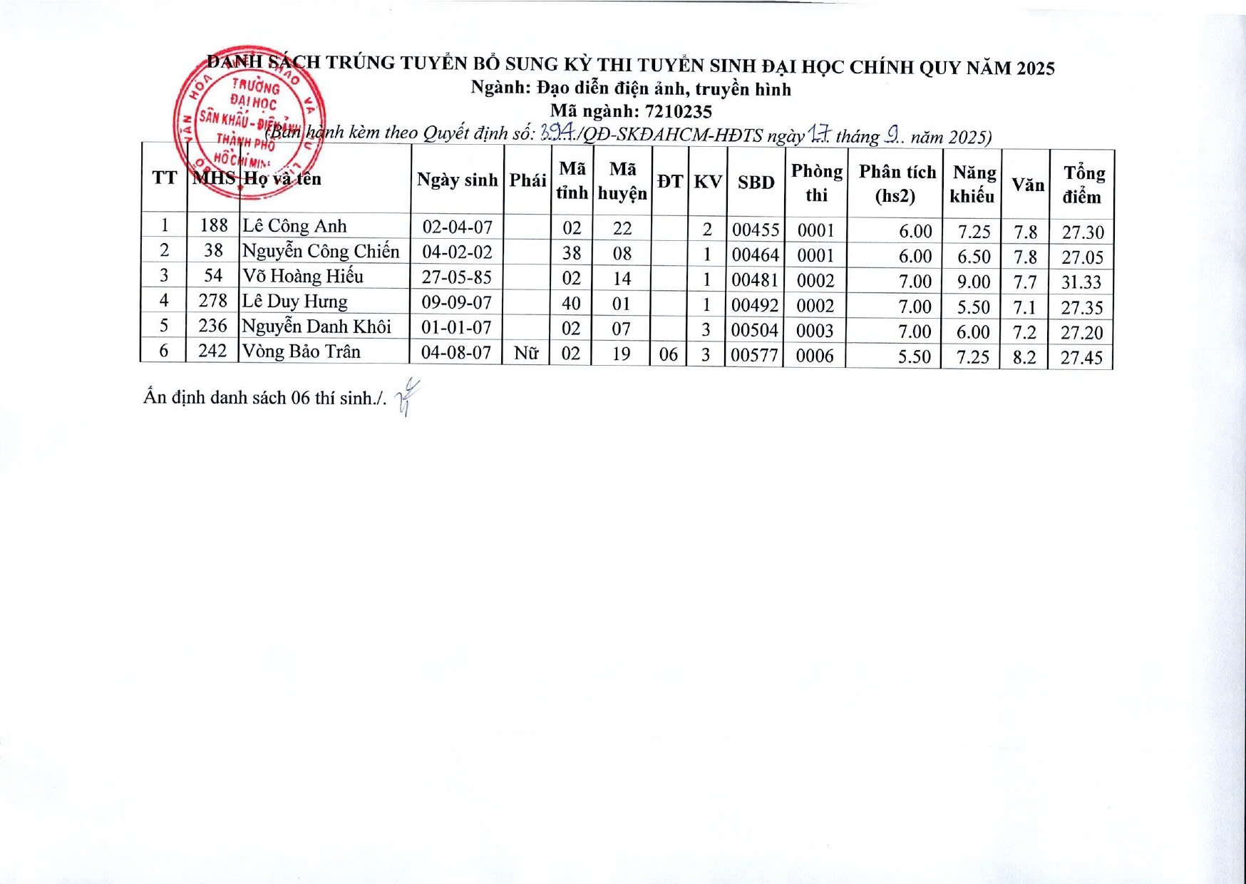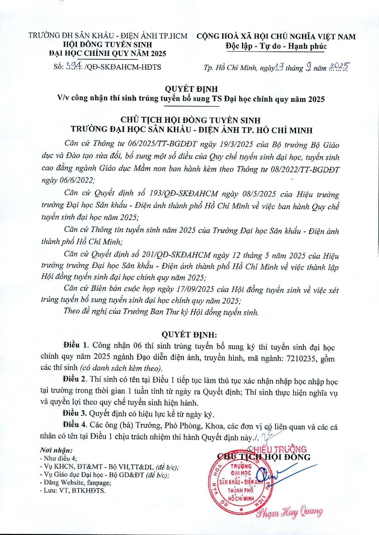 Chính quy, Quyết định, Thông tin, Tuyển sinhQuyết định V/v công nhận thí sinh trúng tuyển bổ sung TS Đại học chính quy năm 2025 📅 Ngày đăng: 18/09/2025 | ✍️ Tác giả: Trường ĐH Sân Khấu - Điện Ảnh Tp. HCM | 👁️ Lượt xem: 5072 Đăng vào 18/09/202519/09/2025 bởi Trường ĐH Sân Khấu - Điện Ảnh Tp. HCM Thông báo V/v thu học phí năm học 2025 – 2026 Quyết định V/v công nhận thí sinh trúng tuyển bổ sung tuyển sinh cao đẳng chính quy năm 2025
