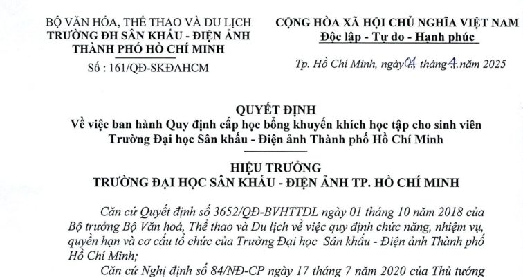 Quyết định về việc ban hành Quy định cấp học bổng khuyến khích học tập cho sinh viên trường Đại học sân khấu – điện ảnh Tp. Hồ Chí Minh