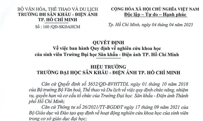 Quyết định về việc ban hành Quy định về nghiên cứu khoa học của sinh viên trường Đại học sân khấu – điện ảnh Tp. Hồ Chí Minh